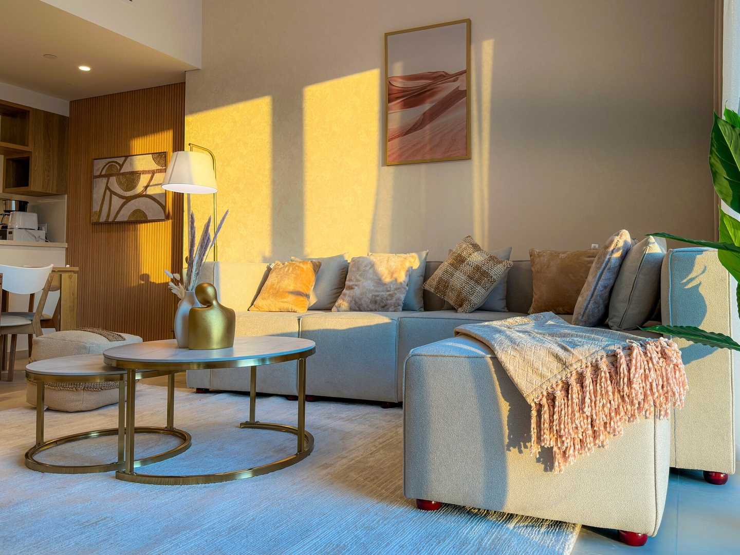 The apartment has 3 bedrooms with one maids room and washroom. The spacious living room is equipped with a large sofa and a smart TV, perfect for relaxation. The dining area provides ample space for meals, while the fully equipped kitchen ensures a seamless cooking experience. The apartment includes three well-appointed bedrooms with king-size beds, high-quality bedding, and en-suite bathrooms. Each bedroom also features its own balcony. A maid's room with a private bathroom is also included.